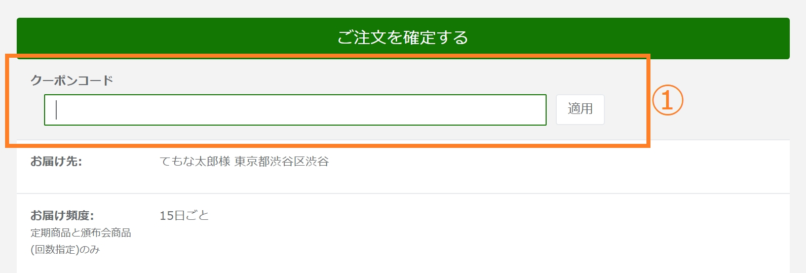 ①「ご注文内容の確認」画面でクーポンコードを入力し、「適用」ボタンをクリックします。