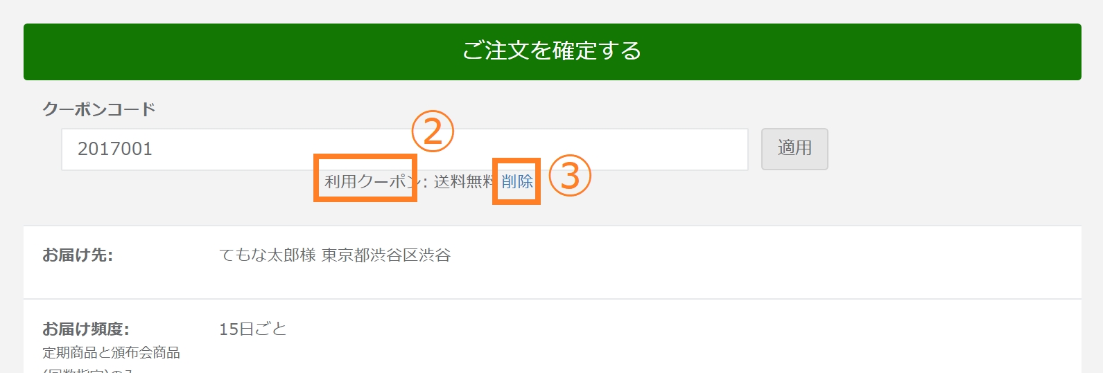 ③「削除」リンクから適用されたクーポンを削除することができます。