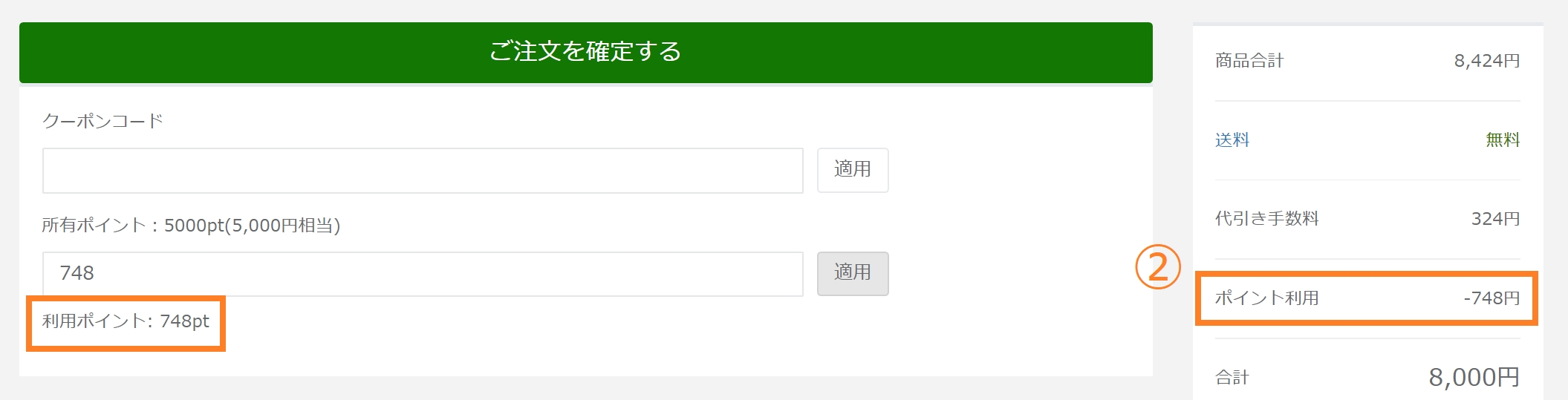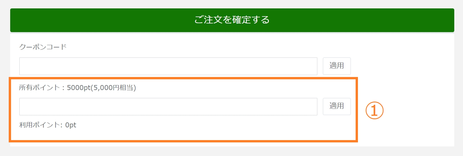 ①ご購入者様がご注文の際にポイントを利用する場合、「ご注文内容の確認」画面に利用可能ポイントが表示されます。利用するポイントの値を入力し、「適用」をクリックします。