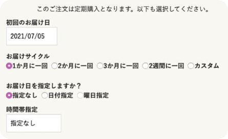 ご注文内容、お客様情報(お名前やご住所)をご確認の上、「お支払い方法」、「初回のお届け日」、次回以降のお届けの「お届けサイクル(周期)」や「お届け日※」「時間帯指定」をお選びください。