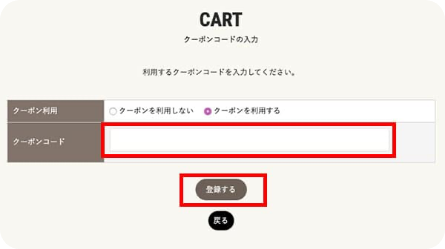 「クーポンを利用する」をクリックし、コードを入力後、「登録する」をクリックしてください。