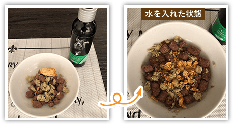 粒のままトッピングや、ほぐして振りかけても良いですが、腎臓や泌尿器の健康に配慮したい場合は、K9ナチュラルをほぐし、2~3倍の水分で戻してから、与えたいペットフードに混ぜてください。