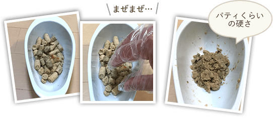 水をかけて、手袋をつけて30秒程ほぐし「ハンバーグのパティ」の硬さで与えます。