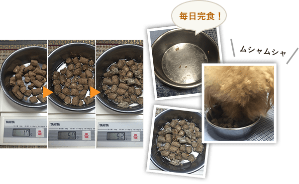 とても活発なので目安の1.5倍ほど与え、水もあまり飲まないので、水分を多めにして、軽く混ぜて与えます。